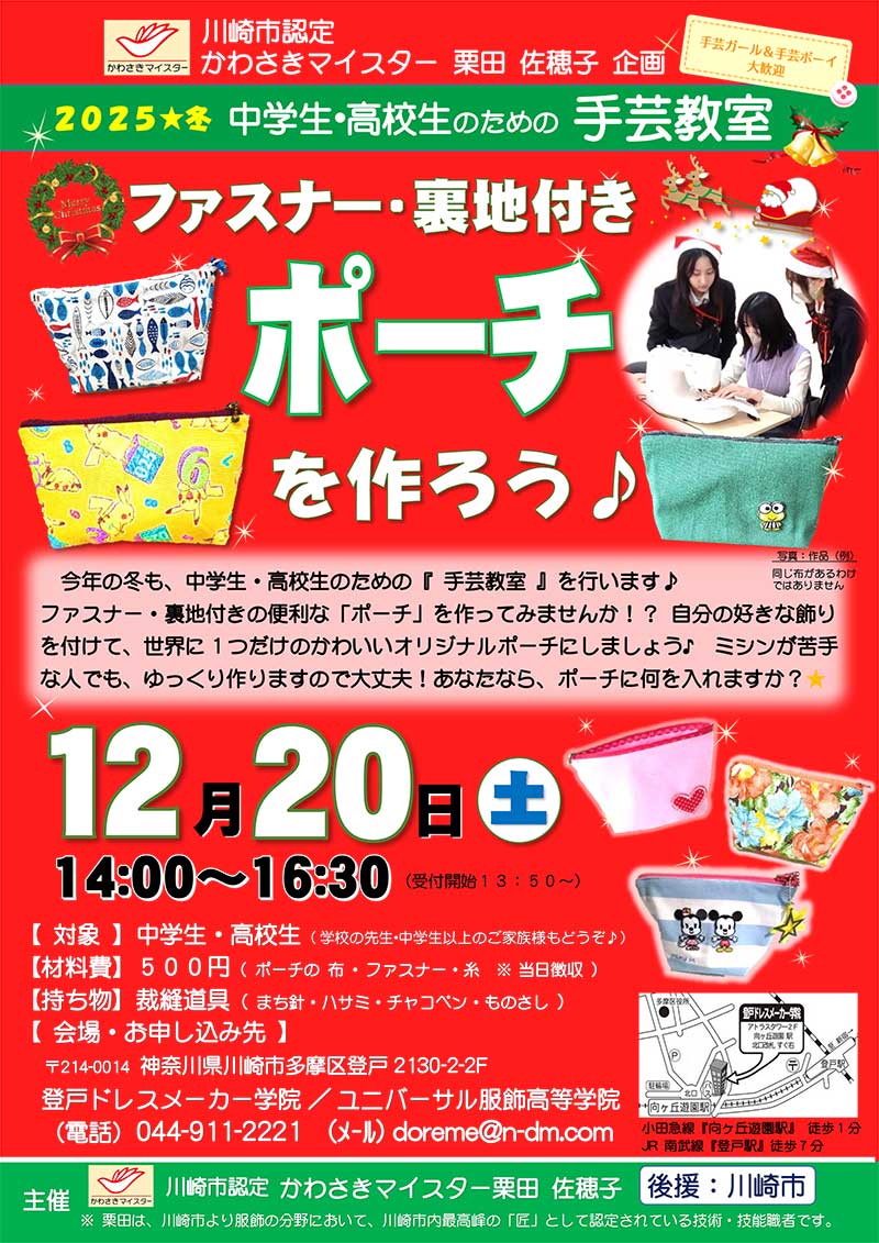かわさきマイスターである栗田が主催し、川崎市後援を得て、若い世代へ手芸・洋裁の楽しさを伝えるため手芸教室を行います。